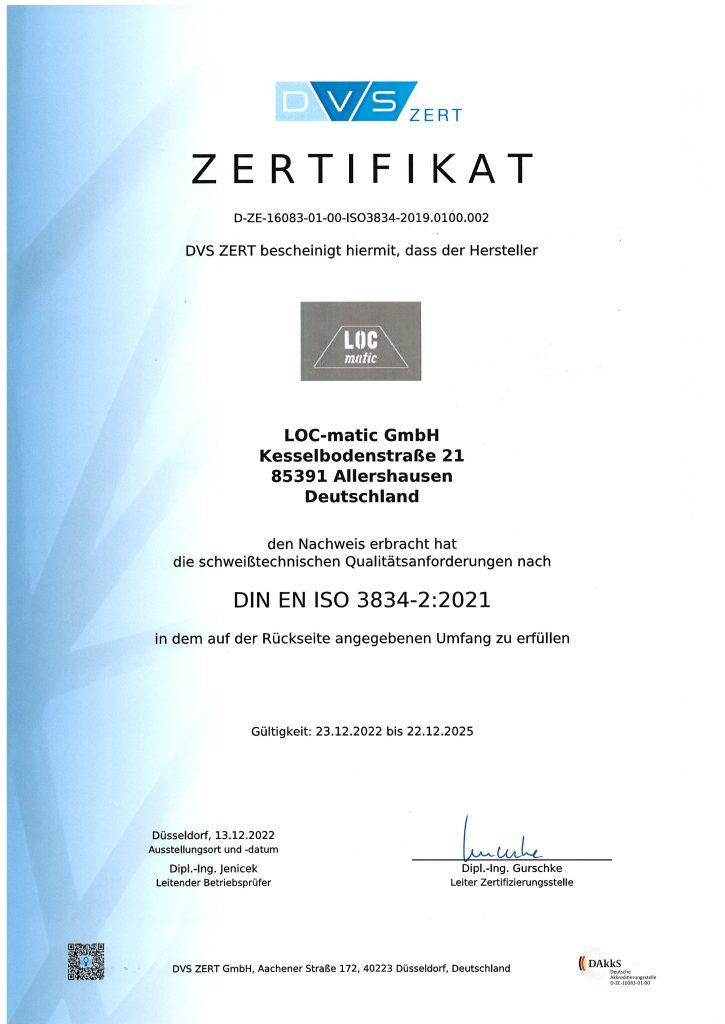 LOC-matic is a manufacturer of attachment tools tested and certified according to DIN EN ISO 3834-2. This international series of standards specifies welding quality requirements and regulates the principles for quality assurance of fusion-welded components and structures. The standard covers welding in individual and series production, repair and assembly and applies to all welding applications. DIN EN ISO 3834 functions both as a quality management system and as a basis for fulfilling the standard requirements in specific application regulations such as EN 1090-1 and EN 15085-2. Certification according to DIN EN ISO 3834-2 represents the comprehensive quality requirement.
